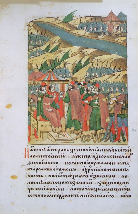 А тем временем князь Ягайло Литовский пришел со всем литовским войском поганому Мамаю и татарам на помощь, а христианам на вред, но и от него Бог избавил: он немного не поспел к сроку из Литовской страны, всего на один день, или того меньше, но только когда услышал князь Ягайло Ольгердович и все его войско,