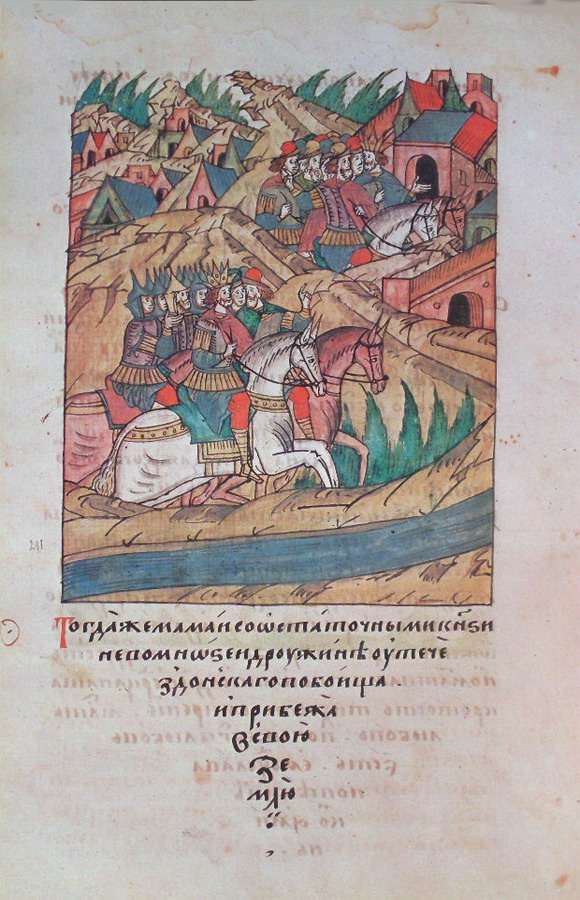А Мамай с оставшимися князьями и с небольшой дружиной убежал с Донского побоища и прибежал в свою землю.