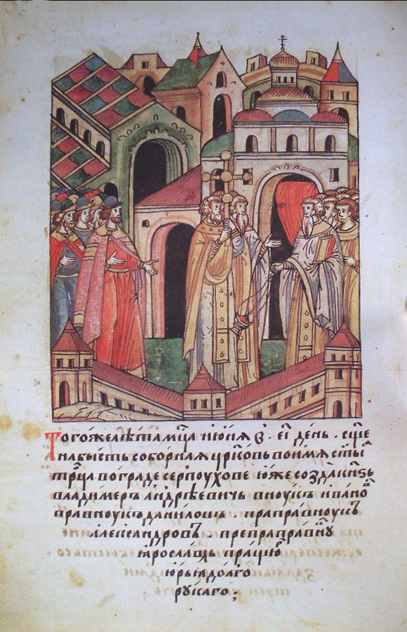 В то же лето, месяца июня в пятнадцатый день, была освящена соборная церковь во имя Святой Троицы в городе Серпухове, и создал ее князь Владимир Андреевич, внук Иванов, правнук Данилов, праправнук Александров, препраправнук Ярославов, пращур его Юрий Долгорукий.