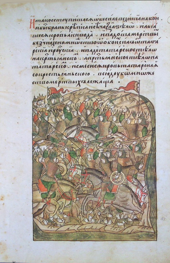 И вот сошлись обе великие силы на бой. И была крепкая битва и злая сеча, и кровь лилась, как вода, и бесчисленное множество воинов с обеих сторон, с татарской и русской, пали мертвыми. И татарское тело падало на христианское, и христианское на татарское, и смешалась кровь татарская с христианской. А всюду лежало такое множество мертвых,