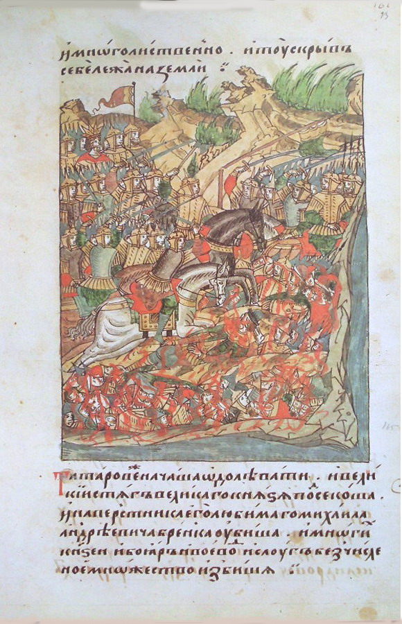 И начали татары одолевать. И подсекли великий стяг великого князя, и его любимого наперсника Михаила Андреевича Бренка убили, и многих именитых князей, бояр, и воевод, и слуг бесчисленное множество перебили.