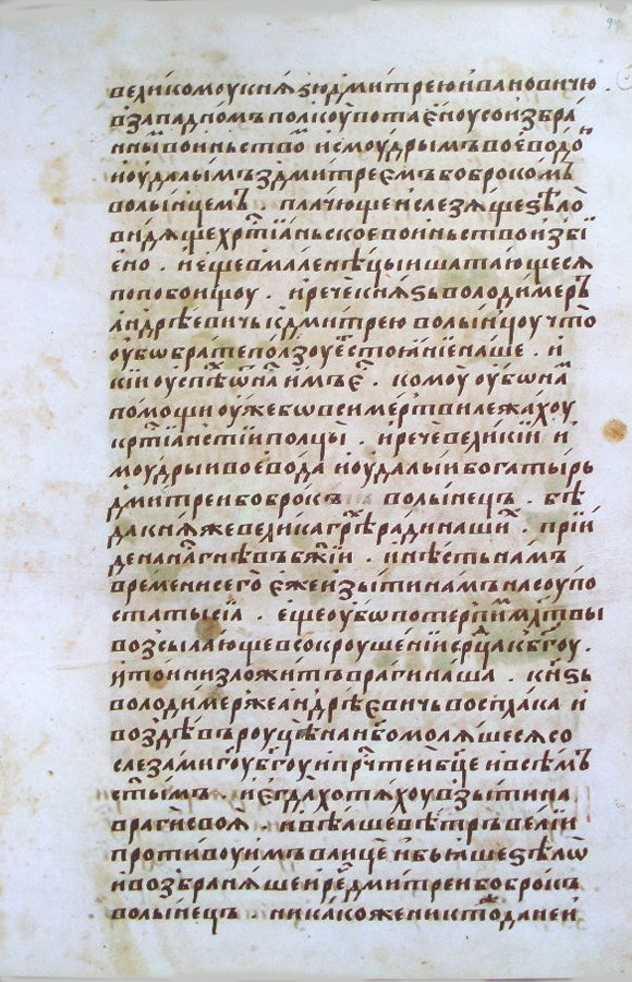 великого князя Дмитрия Ивановича, а с ним отборное войско с мудрым и храбрым воеводой Дмитрием Боброком Волынцем. Плакали они горько, видя, что христианское войско избито и уже только редкие воины блуждают по полю боя. И сказал князь Владимир Андреевич: "Что, брат, пользы от нашего стояния; какая им от нас помощь? Кому же нам помогать, ведь все христианские полки лежат мертвые!" И сказал великий и мудрый воевода и удалой богатырь Дмитрий Боброк Волынец: "Велика беда, князь! За наши грехи пал на нас гнев Божий, и не время нам сейчас выйти против супостатов. Потерпим же еще, воссылая молитвы к Богу, в сокрушении сердца, и он низвергнет наших врагов". И князь Владимир Андреевич заплакал, и, воздев руки к небу, молился со слезами Господу Богу, и пречистой Богородице, и всем святым. А когда хотели они выступить против врагов, то дул им в лицо большой ветер и сильно бил, препятствуя этому. И Дмитрий Боброк Волынец сказал: "Никто пусть не выходит на бой ни в коем случае.