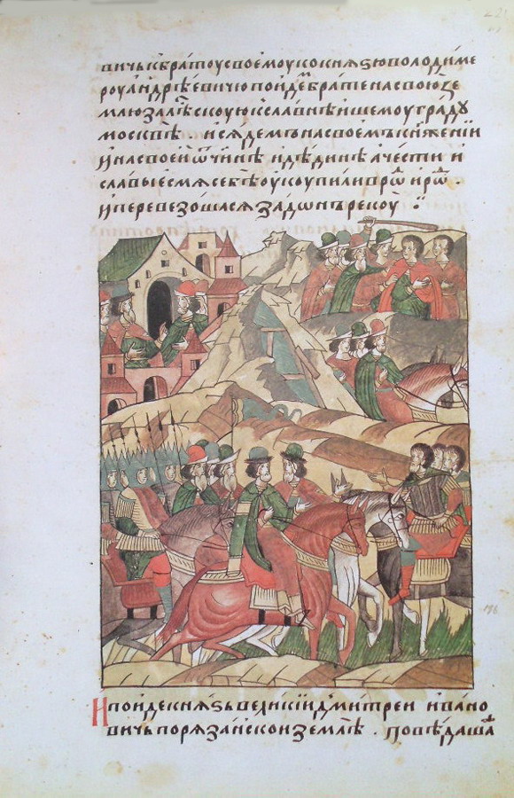 брату своему князю Владимиру Андреевичу: "Пойдем, брат, на свою землю Залесскую[1], к славному городу Москве и сядем на своем княжении, на своем отцовском и дедовском столе, ведь мы приобрели себе чести и славы на весь свой род". И переправились они через Дон.