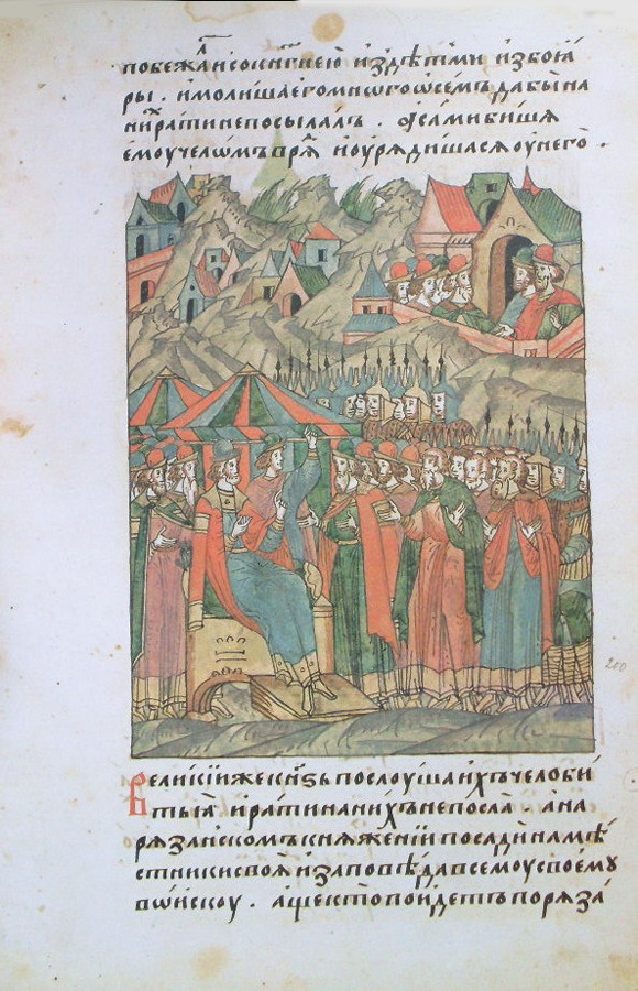 а сам сбежал вместе с княгиней и с детьми и с боярами. И они очень просили его, чтобы он не посылал на них войска, а сами били ему челом о договоре — и заключили договор.