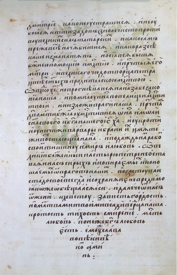 Как же не устрашился ты идти за Дон, в чистое поле, против великих сил татарских, как ты сам вперед всех начал биться, как ты рубил измаильтян? И было все это помощью Божьей, и пречистой Его Матери, и великого чудотворца Петра, и всех святых и родительской молитвой! О владыко Христе, не прогневайся на нас за наши беззакония, но помилуй нас по великой твоей милости и низложи врагов наших! О пречистая дева Мати Божья, прояви к нам свою милость и моли Сына своего и Бога нашего Иисуса Христа и укроти и уничтожь варваров, войны их и мятежи, восстающие против нас, дай нам, рабам твоим, мир и любовь! О великий блаженный пастырь Петр, не оставляй нас, сирых, попираемых и поносимых нашими врагами, но защищай стадо свое всегда и сохраняй невредимо, как ты обещал, и отгони далеко от нас клевету, зависть, гордость, но молитвами твоими всели в сердца наши кротость, тихость, смирение, любовь, потому что Бог есть любовь, и ему слава во веки веков. Аминь.