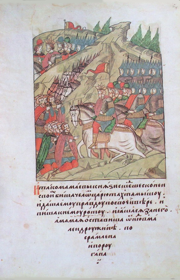 И вот Мамаевы князья, сойдя с коней, били челом царю Тохтамышу, поклялись по обычаю своей веры, принесли присягу и остались у него на службе, а Мамая, посрамленного и поруганного, оставили с самой небольшой дружиной.